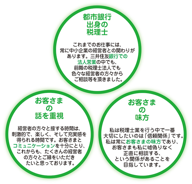 私のこれまでのお仕事には、常に中小企業の経営者との関わりがあります。学生時代から商売をしている父を見て、経営というものに興味を持ち、経営者をリスペクトするようになりました。三井住友銀行での法人営業の中でも多くの経営者とお話させていただきましたし、前職の税理士法人でも色々な経営者の方々からご相談等をいただきました。経営者の方々と接する時間は、私の人生の中で一番刺激的で、楽しく、そして充実感を得られる時間です。これからも、たくさんの経営者の方々とご縁をいただき、充実した税理士人生を送っていきたいと思っております。
